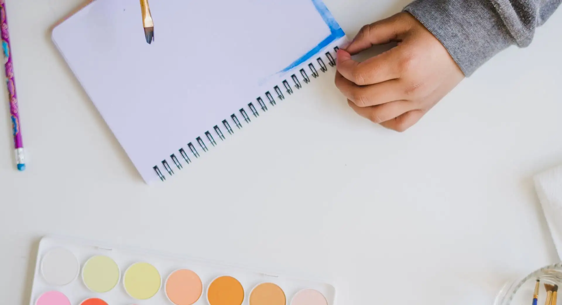 HomeLEGOLAND Florida: A person is writing on a notebook next to paints and watercolors.