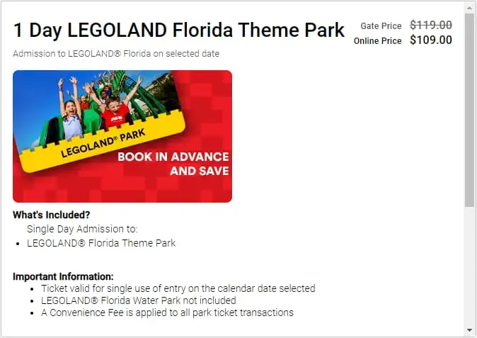 1 Day LEGOLAND Florida Theme Park Ticket Cost